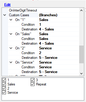 In diesem Skript verwendet die Asrmenu-Aktion die Verzweigung CustomCases für die Weiterleitung von Anrufen auf der Basis von drei verschiedenen möglichen Aussagen des Anrufers: Vertrieb, Service oder Wiederholen. Diese Werte werden in der Verzweigung definiert und für das Erkennen der Aussage des Anrufers verwendet.