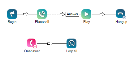 In diesem Beispiel stellt das System einen Anruf durch, spielt eine Nachricht ab und dann hängt das Skript das Gespräch auf. Außerdem löst das Onanswer-Ereignis die Protokollierung des Anrufs aus, wenn der Anruf angenommen wird.