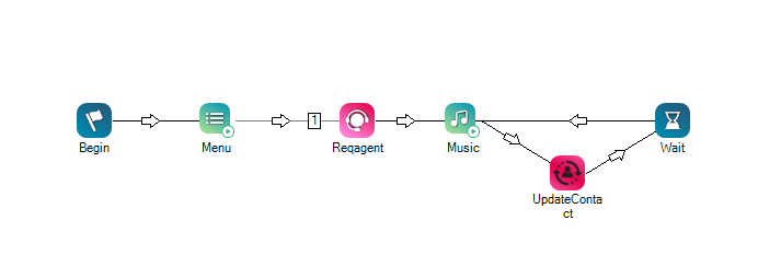 In diesem Beispiel wird mit der ReqAgent-Aktion festgelegt, dass die Interaktion von einem Agenten gehandhabt werden soll, der über eine Skill-Fähigkeit zwischen 5 und 12 verfügt. Die Music-Aktion ist so konfiguriert, dass sie 60 Sekunden lang abgespielt wird. Wenn nach 60 Sekunden noch kein Agent auf die Interaktion geantwortet hat, erweitert UpdateContact den Agentenpool, indem für die Fähigkeit ein Bereich von 2 bis 14 festgelegt wird.