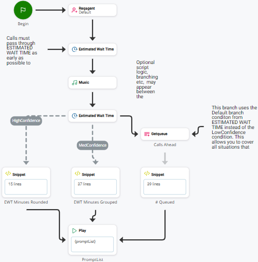 In diesem Beispiel wird die Verwendung von Estimated Wait Time in einem Skript beschrieben. Es werden zwei Estimated Wait Time-Aktionen verwendet; eine unmittelbar nach Reqagent und eine zu einem späteren Zeitpunkt im Skript. Mit der Platzierung von Estimated Wait Time direkt nach Reqagent wird die genaueste Berechnung der Aktion erreicht.