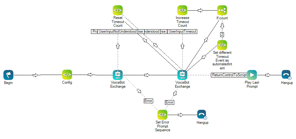 In diesem Skript werden Snippet -Aktionen zum Erstellen und Erhöhen eines Zeitüberschreitungszählers verwendet. Nach der zweiten Zeitüberschreitung wird eine Snippet -Aktion verwendet, um ein anderes Zeitüberschreitungsereignis zu setzen. Das alternative Zeitüberschreitungsereignis wird über die automatedIntent -Eigenschaft von der Snippet -Aktion an die Voicebot-Aktion übergeben.