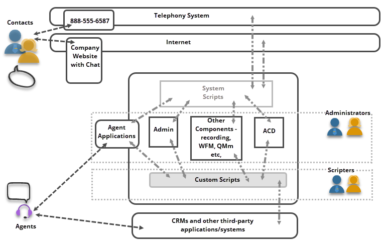 Das folgende Diagramm zeigt eine Übersicht über CXone Mpower und wie es sich in Ihre Organisation insgesamt einfügt. Es zeigt auch, wie Skripte mit jedem Teil von CXone Mpower sowie mit den Anwendungen und Systemen außerhalb von CXone Mpower interagieren.