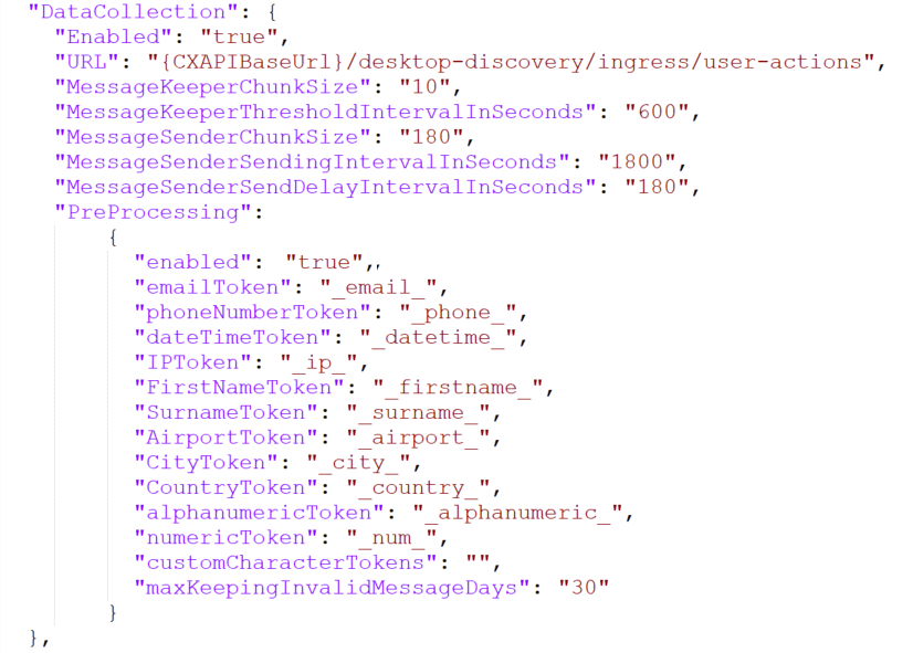 Damit diese Funktion ordnungsgemäß funktioniert, stellen Sie sicher, dass die Eigenschaft DataCollection in der DateiCXDClientConfig.jsonaktiviert ist. Alle Attribute sind optional und verwenden ihre Standardwerte, wenn sie nicht angegeben werden.