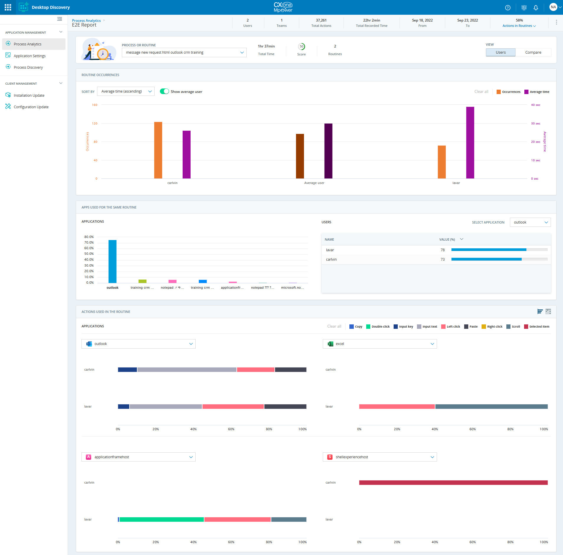 Erweitern Sie die Aktionen in Routinen, um den Prozentsatz der Aktionen anzuzeigen, die zu einer der Routinen im Bericht gehören. Dies zeigt an, welcher Teil der Arbeit der Mitarbeiter insgesamt dargestellt wird. Sie umfasst zwei Abschnitte, einen für die Anwendungen und einen für die Nutzer.
