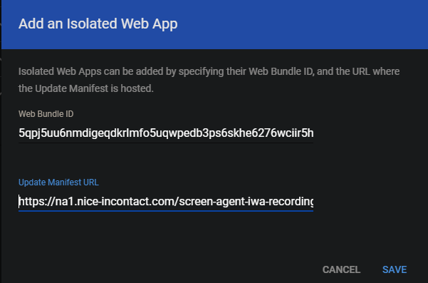 • Manifest-URL aktualisieren: \u003cCXone host domain\u003e /screen-agent-iwa-recording/update.json (Die Hostdomäne ist für jede Region unterschiedlich, zum Beispiel: https://na1.nice-incontact.com/screen-agent-iwa-recording/update.json)
