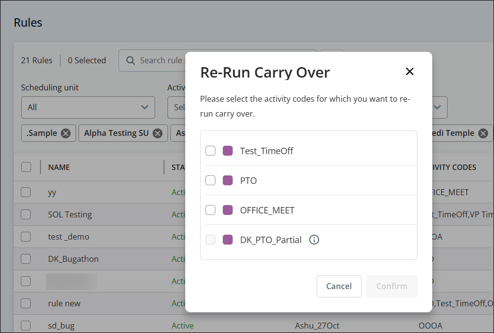 Im Dialogfeld Re-Run Carry Over wählen Sie die Aktivitätscodes aus, die Sie einbeziehen möchten.
