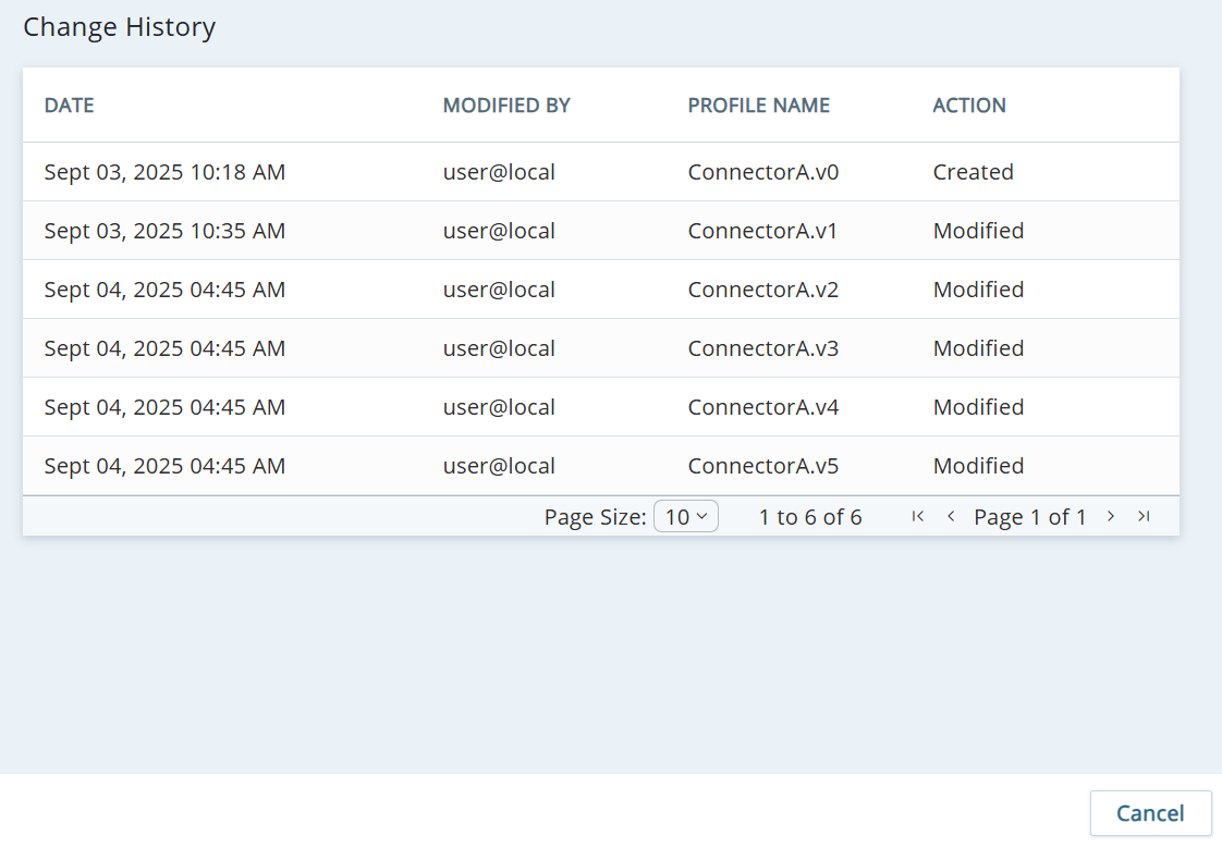 Cada conexión en Integration Hub tiene un registro de cambios. Cada vez que se crea o actualiza una conexión, se registran los siguientes detalles: