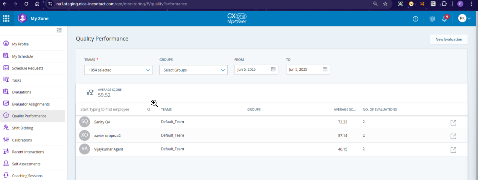 Con la métrica de puntuación Quality Management, puedes ver puntuaciones de calidad en cada parte de Quality Management. El sistema usa los puntos obtenidos o ganados cuando hay más de una evaluación en el total. Las métricas de puntuaciónQuality Management se pueden calcular como el promedio de las puntuaciones porcentuales o como un promedio de los valores reales.
