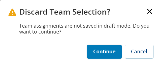 Cliquez sur Continuer pour annuler la sélection de l'équipe et sauvegarder la configuration du brouillon.