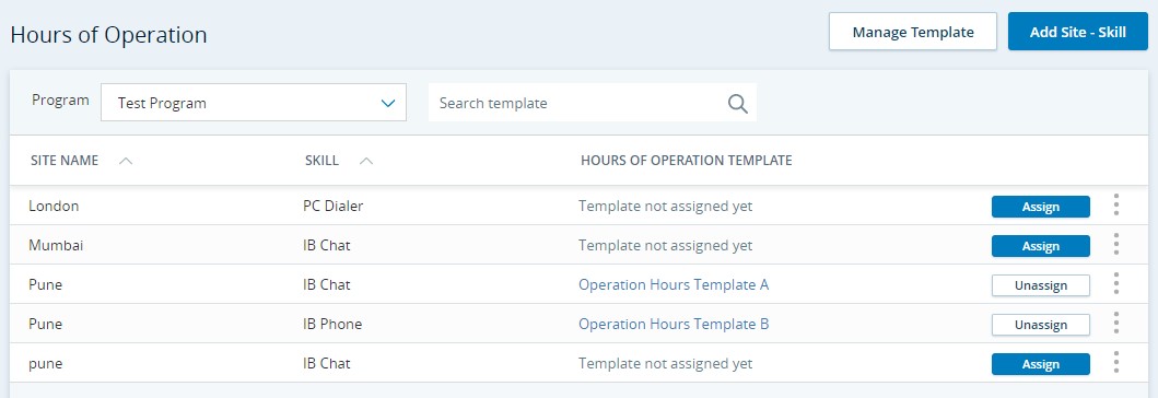 Étant donné que vous pouvez avoir de nombreuses combinaisons de sites et de compétences avec les mêmes heures d’ouverture, vous devez créer des modèles d’heures d’ouverture. Attribuez un modèle à chaque site et combinaison de compétences. Vous pouvez également créer une copie de n’importe quel modèle existant.