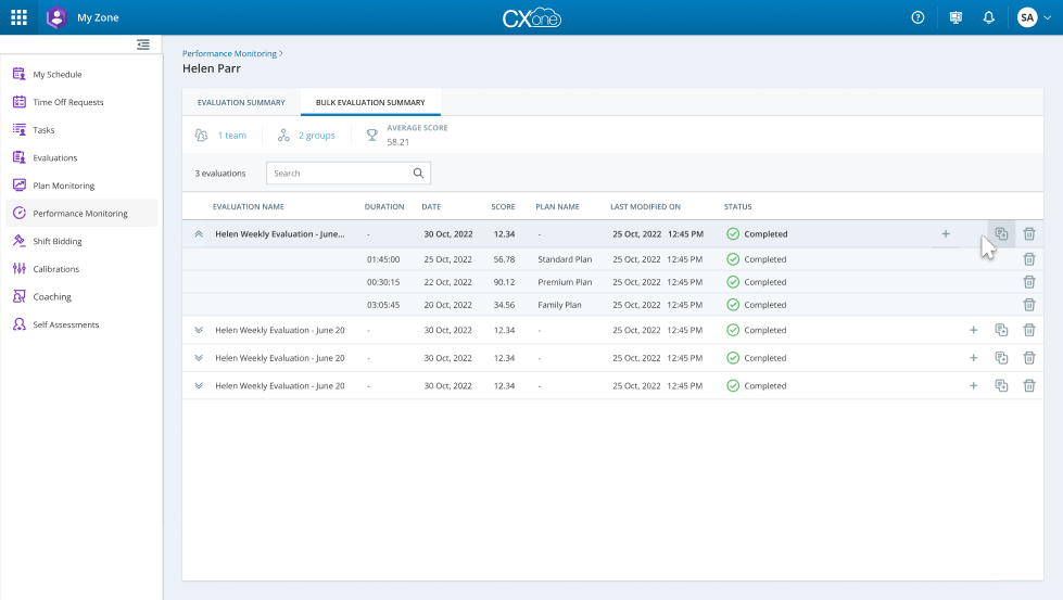 Affiche le score moyen global de toutes les évaluations correspondant aux filtres sélectionnés. Rechercher Permet la recherche par nom d'évaluation. Nombre d'évaluations Affiche le nombre total d'évaluations (par exemple, 3 évaluations). Nom de l’évaluation Affiche le nom de l'évaluation (par exemple, Évaluation hebdomadaire d'Helen - Juin). Durée Affiche le temps total nécessaire pour effectuer l'évaluation. Date