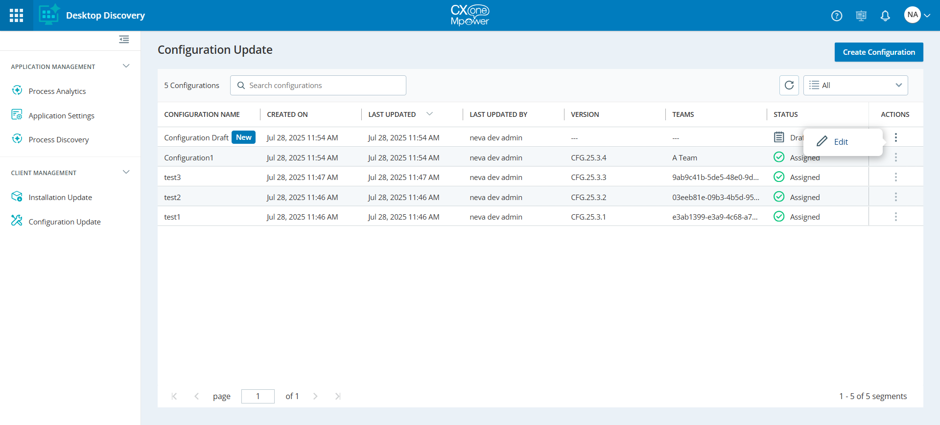 Pour accéder à la fonctionnalité de mise à jour de la configuration, l'application Desktop Discovery doit être activée sur le locataire CXone. Reportez-vous à Gérer les locataires pour activer les applications CXone Mpower.