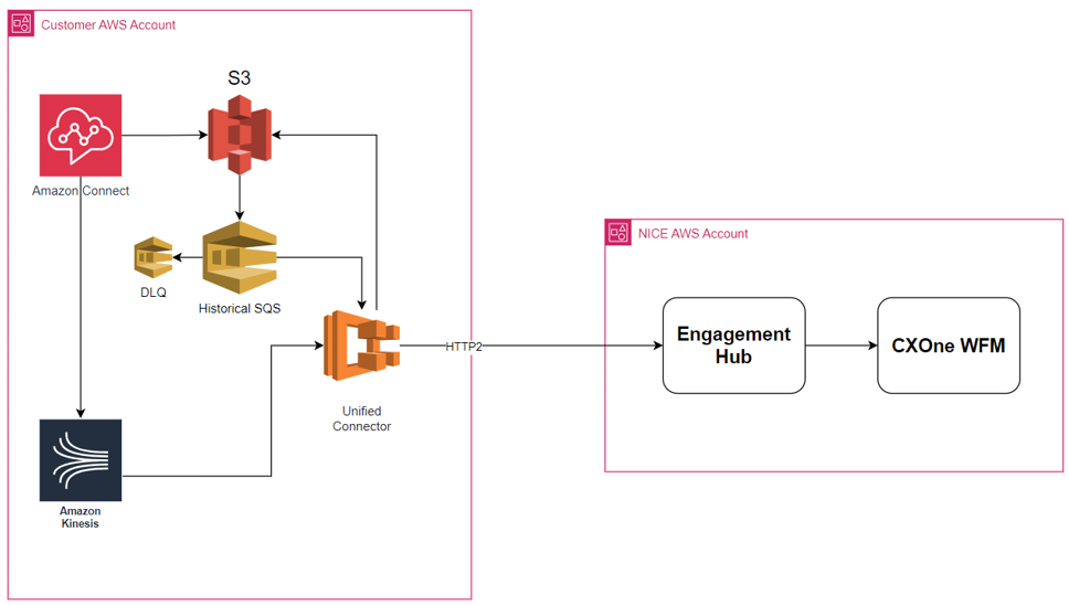 Cette page aide les clients à intégrer Amazon Connect ACD avec CXone WFM en utilisant le Hub d'engagement. Il fournit des conseils de mise en œuvre pour l'intégration des canaux vocaux et de chat entrants, à destination des administrateurs informatiques, des intégrateurs de systèmes et des planificateurs WFM.