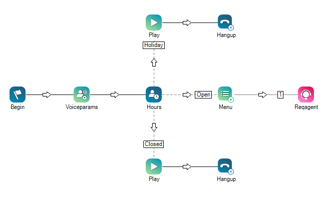 このスクリプトの例では、呼び出しは、Hoursアクションで設定された時間プロファイルに基づいて転送されます。 会社が開いている場合、通話はキューに入れられ、コンタクトのMenu選択に基づいてエージェントに配信されます。 会社が休業中または休暇中の場合、PlayアクションはTTSを使用してメッセージを配信します。 スクリプトの開始時のVoiceparamsアクションにより、TTS音量、レート、音声などが確立されます。