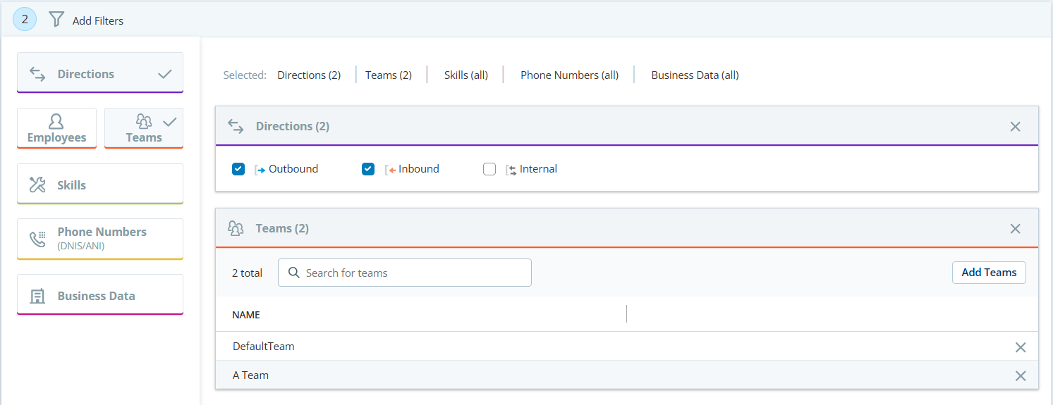 従業員、チーム、スキル、および電話番号の少なくとも1つのフィルターを選択します。 さらに、方向およびビジネスデータのフィルターも追加できます。
