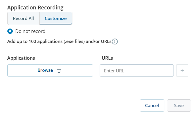 機密データを保護するアプリケーションおよびURLの拒否リストを定義できます。 拒否リストに含まれるアプリケーションまたはURLがエージェントの画面で開くと、画面録画は停止します。
