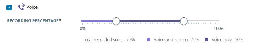 音声とダイヤラの対話では、録音する通話の割合を設定します。 画面録画を含める必要がある通話の割合を設定することもできます。 ダイヤラコール(エージェントまたはエージェントレス)の場合、インタラクションは顧客がコールに応答した瞬間から記録されます。 通話が4秒未満の場合、それは短い通話と見なされ、記録されません。