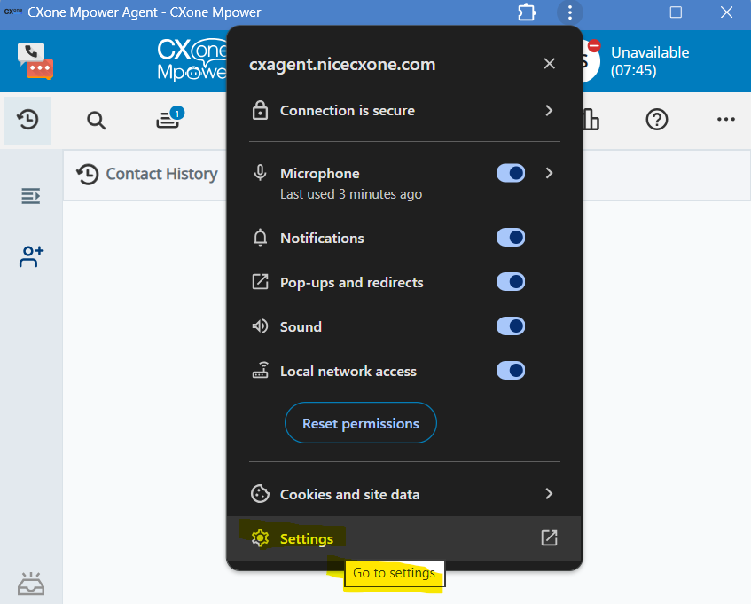 これを修正するには、ローカル ネットワーク アクセスを許可する必要があります。 これは Google Chrome および Microsoft Edge ユーザーに適用され、MAXAgentSalesforce Agentなどすべての CXone クライアントに影響します。 以下の手順は CXone Agent と MAX の例を示していますが、プロセスはどれも同じです。
