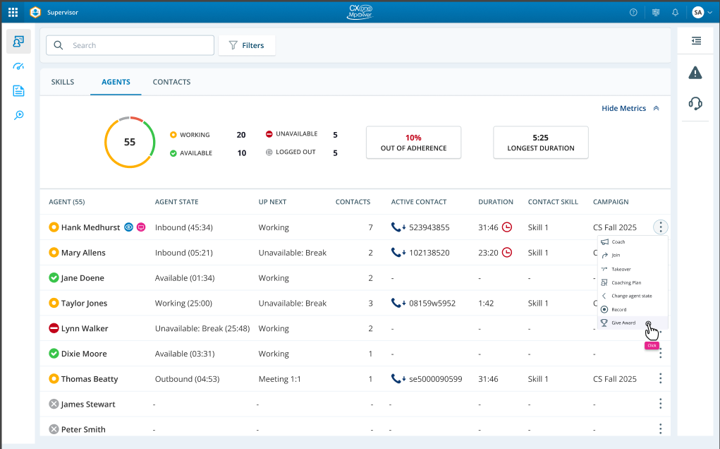 スーパーバイザー アプリに移動し、リアルタイム監視画面を開きます。 特典を授与オプションは、アクティブで作業中のエージェントにのみ利用可能です。