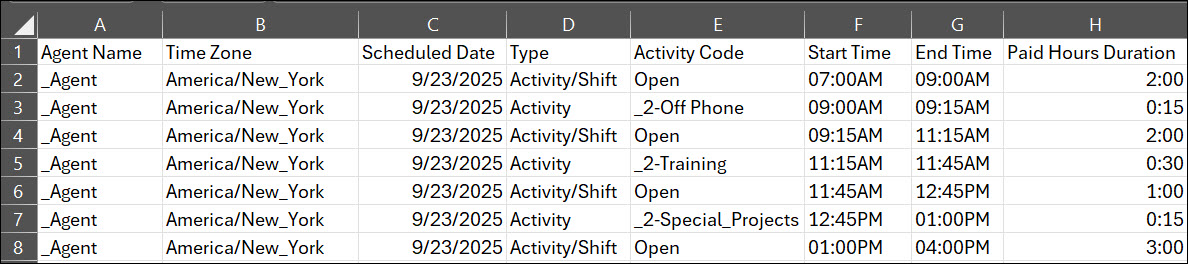 エクスポートされた CSV ファイルは読みやすく理解しやすく、日常のアクティビティを 1 行ごとに明確に分類できます。 各エントリにはアクティビティ、シフト、またはその他のタイプとしてラベルが付けられ、スケジュールをより整理して表示できます。 データはタイムラインごとに並べ替えられているため、追跡しやすく、使用しやすくなっています。 これらの改善により、エクスポートされたファイルはレポート作成、分析、ワークフォース計画に一層役立つものとなります。