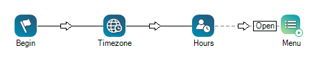 이 기본 부분 전화 스크립트 예시에서, Begin이(가) 스크립트를 트리거하고, TimeZone 속성(Timezone 작업 내)을 사용해 동부 표준시로 표준 시간대를 설정합니다. 그다음 스크립트는 운영 시간 프로파일(Hours 작업에서 생성)을 사용해 컨택 센터가 열려 있는지 여부를 결정합니다. 열려 있을 때는 Menu에서 발신자에게 옵션을 제공합니다.