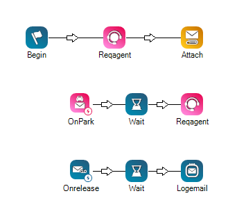 이 예시에서, OnPark 이벤트는 이메일이 대기열에 다시 추가되어 다른 상담원에게 전달되기 전 일정 시간 동안 상담원의 대기열에 파킹되도록 합니다.