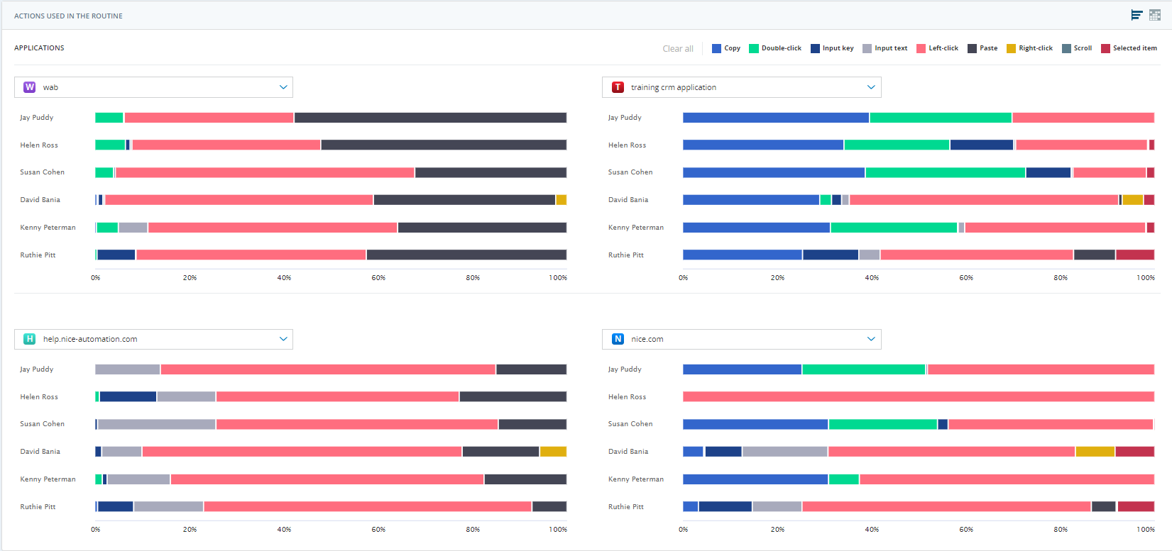 이 차크 보기는 사용자가 루틴 또는 프로세스의 일부인 상위 4개의 애플리케이션과 각각 어떻게 상호작용하는지를 표시합니다. 위젯은 최대 4개의 차트를 표시합니다. 각 차트는 애플리케이션과 사용량 패턴과 상호작용하기 위해 사용된 다양한 작업의 지분을 나타냅니다. 다양한 애플리케이션에서 모든 사용자가 수행한 다양한 작업의 백분율 지분을 확인하고 쉽게 비교할 수 있습니다. 작업 전용 바로 마우스를 가져가 애플리케이션별로 작업별 백분율 값을 확인하십시오. 차트에서 작업을 클릭하면 드릴다운 데이터가 그리드 형식으로 표시됩니다. 이 경우 특정 선택 항목에 대해서만 데이터가 표시됩니다. 전체 데이터를 그리드 형식으로 보려면 아이콘을 클릭합니다. 그리드 보기에 대한 자세한 내용은 그리드 보기를 참조하십시오.