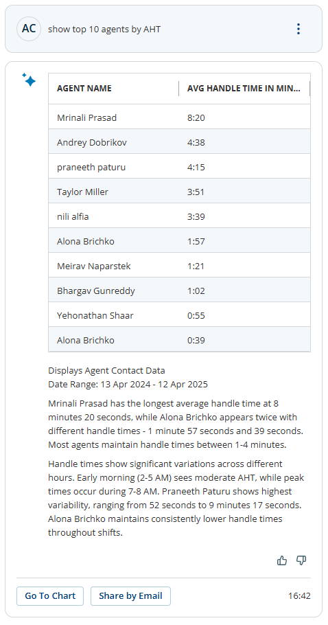 존은 "지난주에 가장 많은 양을 기록한 컨택 이유 상위 10개를 보여주세요" 및 "지난주에 평균 고객 감성이 가장 낮은 팀 10개를 보여주세요"와 같이 자연어로 된 다른 메트릭을 요청합니다.