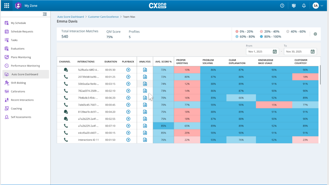 자동 점수 대시보드는 고객 관리 우수성, 규정 준수 및 정확성, 지식 및 도구 숙련도와 같은 주요 지표 전반에 걸쳐 팀 성과를 통합적으로 보여줍니다. 또한 관리자들이 데이터 기반 통찰력을 활용하여 팀 성과를 모니터링하고, 문제를 파악하고, 맞춤형 코칭을 제공하는 데 도움이 됩니다. 이 대시보드는 My Zone에 통합되어 있으며 적절한 권한을 가진 관리자와 감독자가 접근할 수 있습니다.