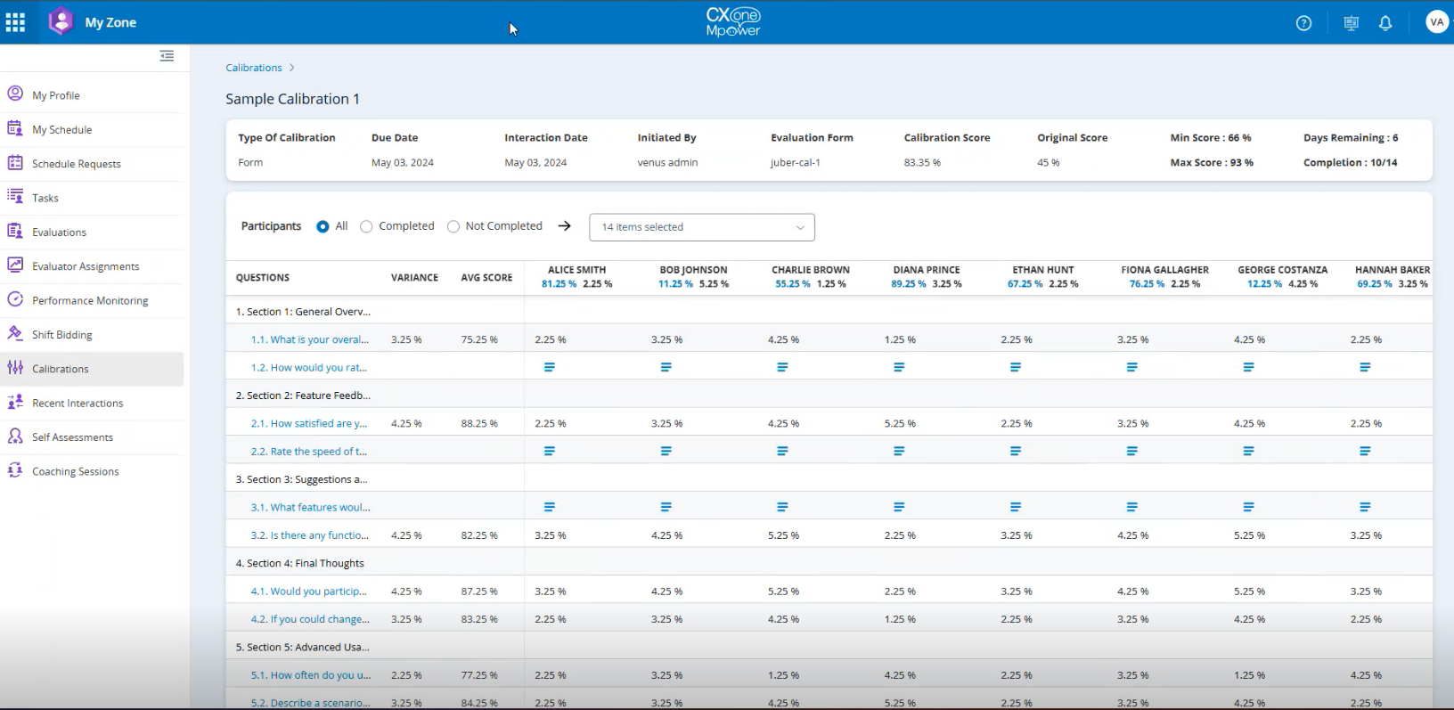 - 완료된 교정 목록에서 두 명 이상의 참가자를 선택하여 평가 점수와 점수 간 분산을 비교합니다.