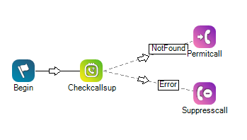 - Sleep de acties Begin, Checkcallsup, Permitcall en Suppresscall naar het script. Koppel Begin aan Checkcallsup. Koppel Checkcallsup aan Permitcall als de NotFound-vertakking, en vervolgens aan Suppresscall als de Found-vertakking.