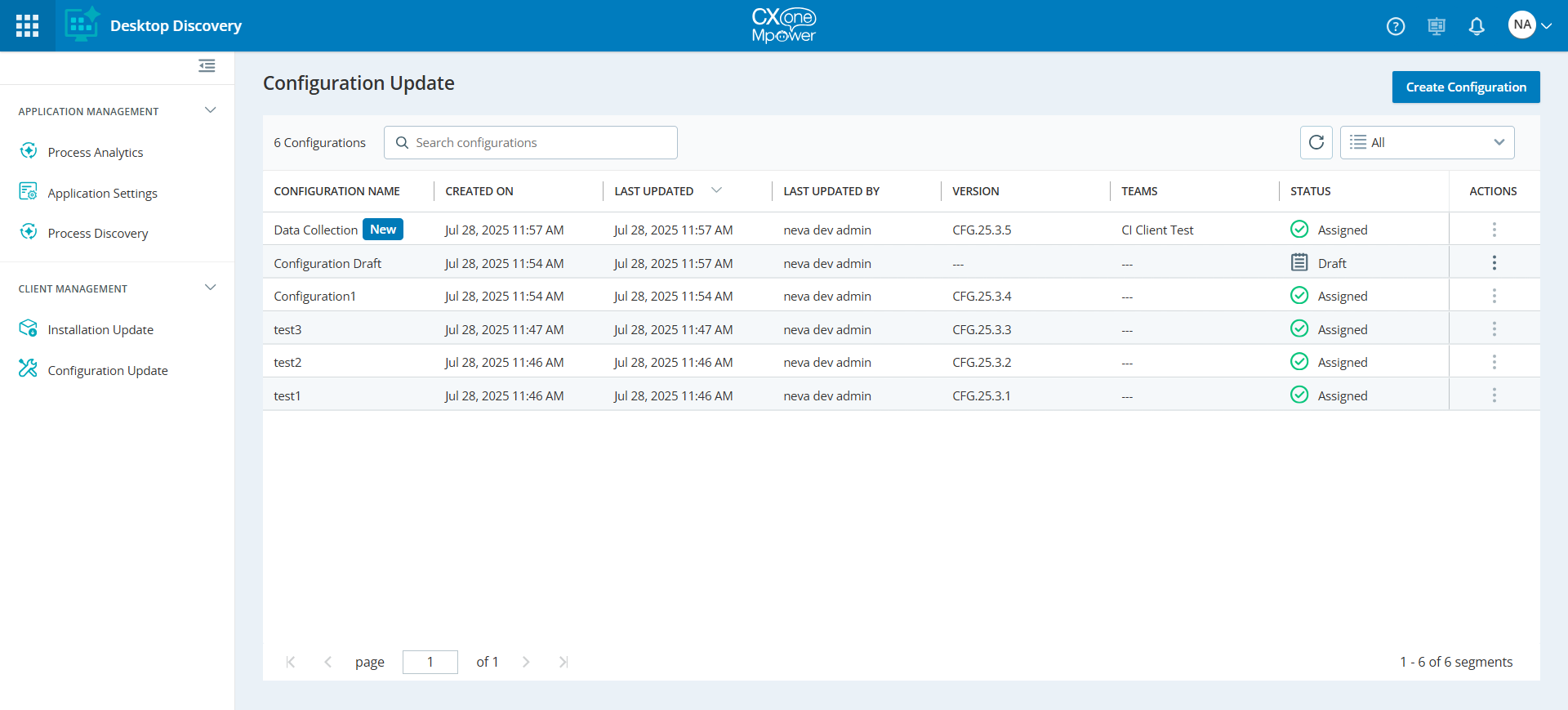 Met de functie Configuratie bijwerken kunnen beheerders en supervisors Desktop Discovery-clientconfiguraties beheren. Ze kunnen nieuwe clientconfiguraties maken en deze eenvoudig toewijzen aan teams op basis van hun vereisten.