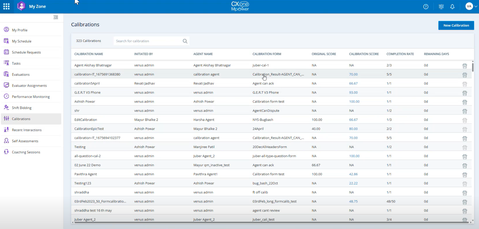 Het kalibratieraster laat zien wie de kalibraties heeft gestart en voor welke agent. Bovendien ziet u de volgende informatie: