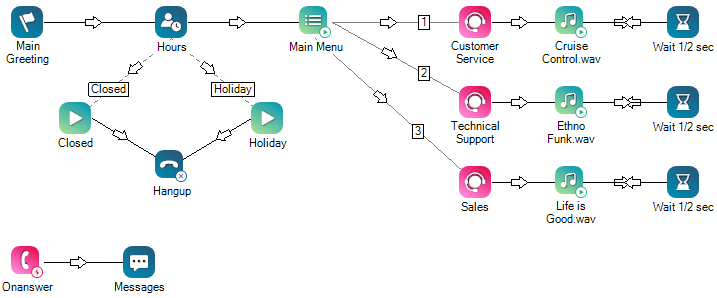 O exemplo de script a seguir demonstra o evento Onanswer. O script configura um RVI de entrada básico com opções de menu para Customer Service, Technical Support, and Sales, which correspond to 1, 2 e 3. Estes representam os números que o contato pressiona no teclado para escolher uma opção de menu. O evento Onanswer está no canto esquerdo inferior do script. Não está conectado à parte principal do script. Em vez disso, é separado, indicando que é uma ação de evento. Assim que um agente responde à interação, o script pula para Onanswer e envia uma mensagem para o agente. A mensagem é configurada na ação Messages.