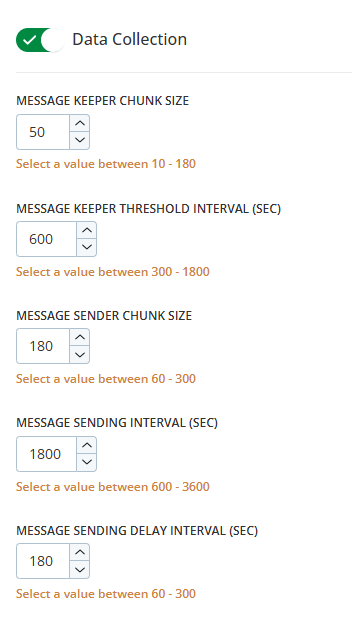 Intervalo de limite do Message Keeper (Sec): Limite de intervalo de tempo para reter novas mensagens antes de acionar as ações do message keeper. Você pode selecionar um valor entre 300 e 1800 segundos. O valor padrão é 600 segundos.