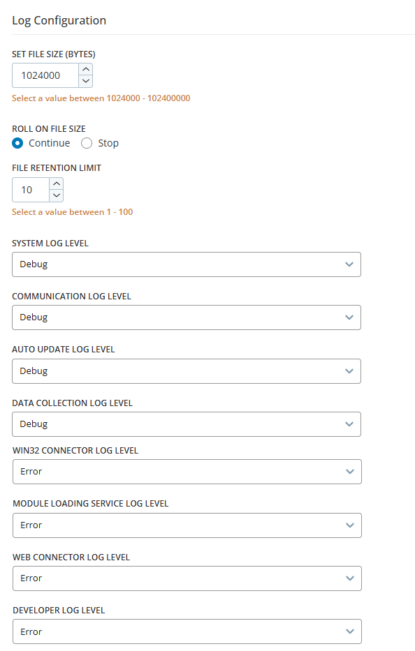 Tamanho do Arquivo Roll On: essa configuração determina se o cliente deve criar um novo arquivo de log quando o limite de tamanho do arquivo (Definir Tamanho do Arquivo (Bytes)) for atingido. Existem duas opções: