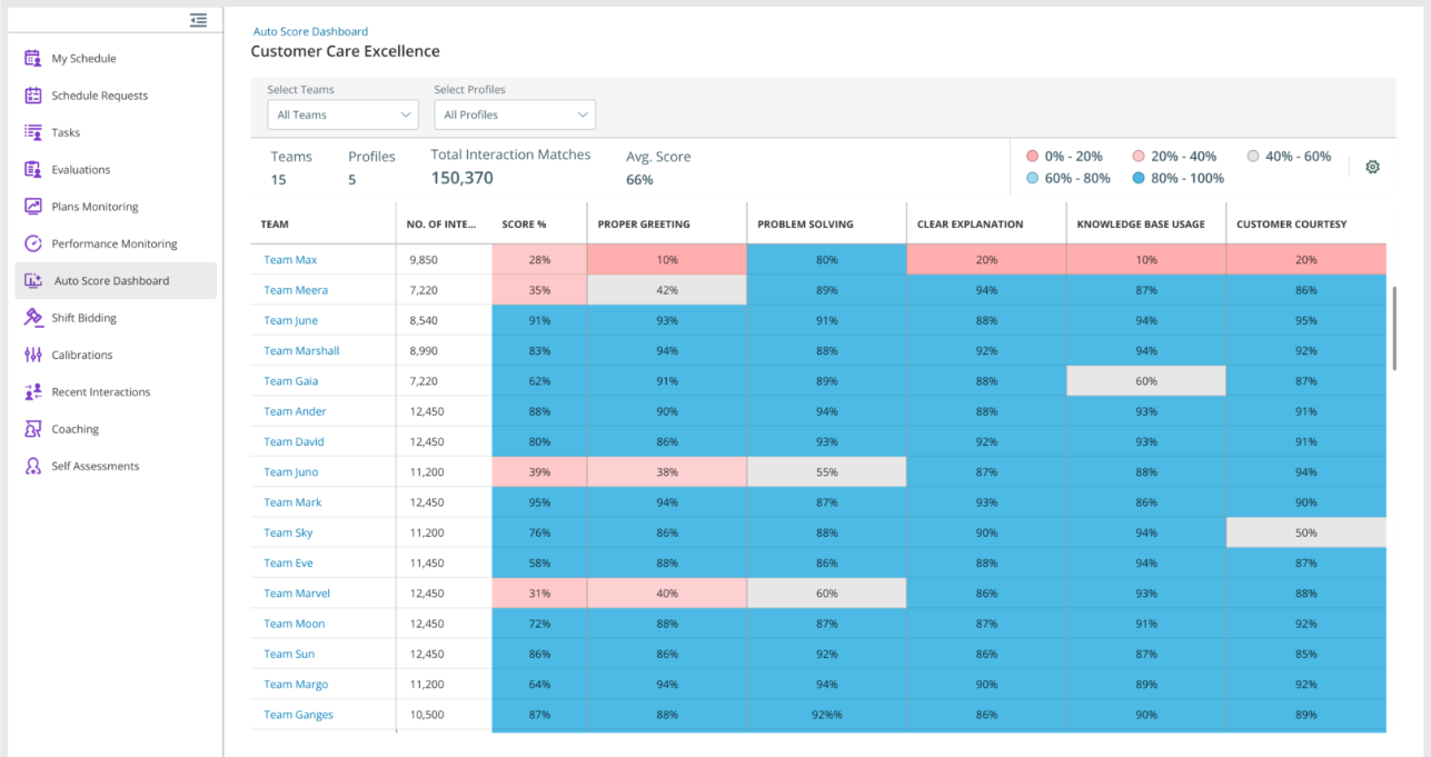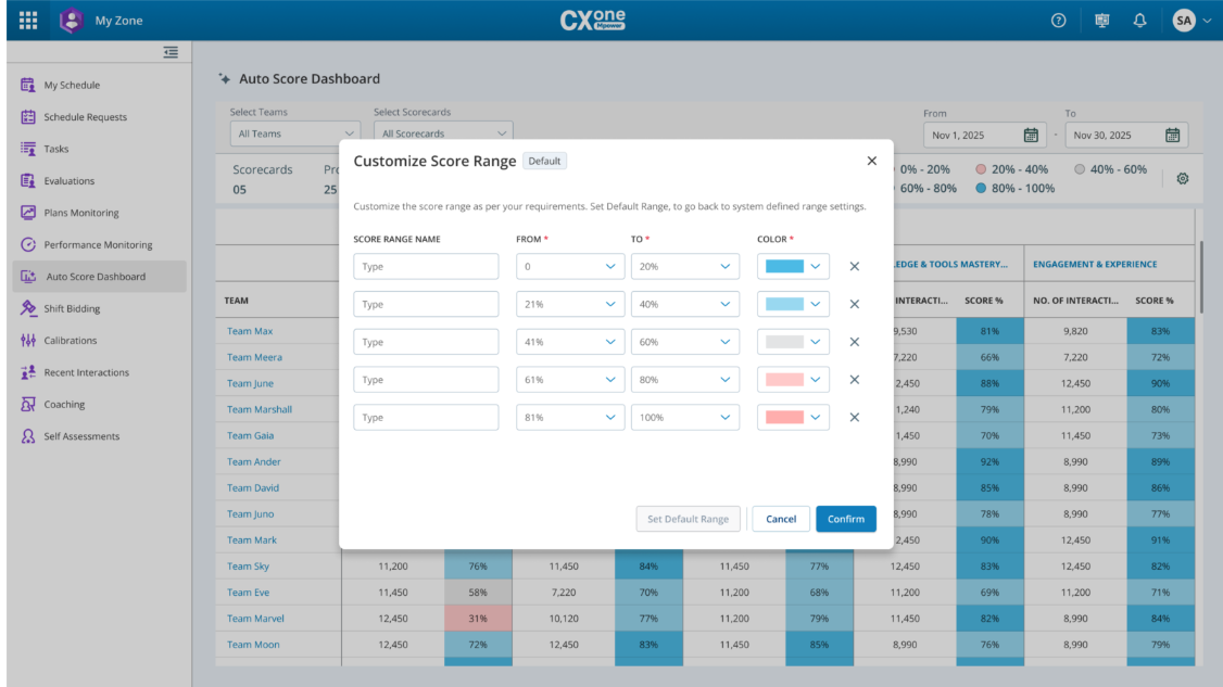 O Painel de Pontuação Automática fornece uma visão consolidada do desempenho da equipe em métricas-chave, como Excelência em Atendimento ao Cliente, Conformidade e Precisão e Domínio de Conhecimento e Ferramentas. Ele também ajuda os supervisores a monitorar o desempenho da equipe, identificar problemas e fornecer treinamento direcionado usando insights orientados por dados. Este painel é integrado ao My Zonee pode ser acessado por supervisores e gerentes com as permissões apropriadas.