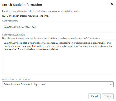 Preencha os campos relevantes. Edite a descrição da empresa, se necessário, selecione a coleção apropriada na lista suspensa Selecionar Topic AI coleção e clique em Enriquecer. O processo de enriquecimento usa dados de interação com o cliente da coleção selecionada para criar um modelo enriquecido que retém o modelo original enquanto adiciona novas intenções e ações.