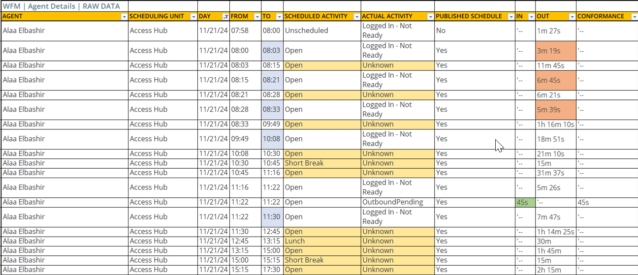 Na tabela, os agentes estão com OOA aberto e severo quando a atividade agendada ou categoria é aberta, e a real é Pausa. No entanto, se o Real for Outbound_Open, eles serão somente OOA aberto e não OOA severo
