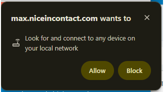 要解決此問題,您必須允許本地網路存取。 這適用於Google Chrome和Microsoft Edge使用者,並影響所有CXone用戶端,包括MAXAgentSalesforce Agent等。 以下步驟顯示了 CXone Agent 和 MAX 的範例,但所有流程都是相同的。